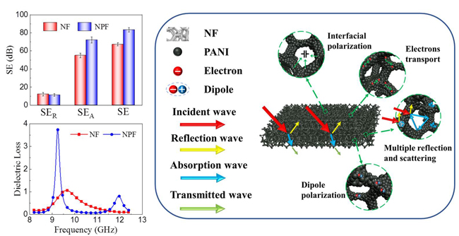Herein, Mr. Han Gao, Miss Chenhui Wang, Miss Zhangjing Yang and Professor Yang Zhang from Beijing Technology and Business University designed and fabricated a 3D porous nickel metal foam (NF)/PANI heterostructure with strong EMI shielding and outstanding absorption performance based on a pre-constructed macroscopic conductive framework. Using a facile in-situ polymerization technique, PANI coating layer was intertwined on the NF substate framework. As a result, Ni/PANI composite foam (NPF) with and unique 3D porous heterostructure was formed. The dielectric behaviors, structure and EMI shielding performance of this structure were systematically investigated. The work is currently published in the journal, Composites Science and Technology.