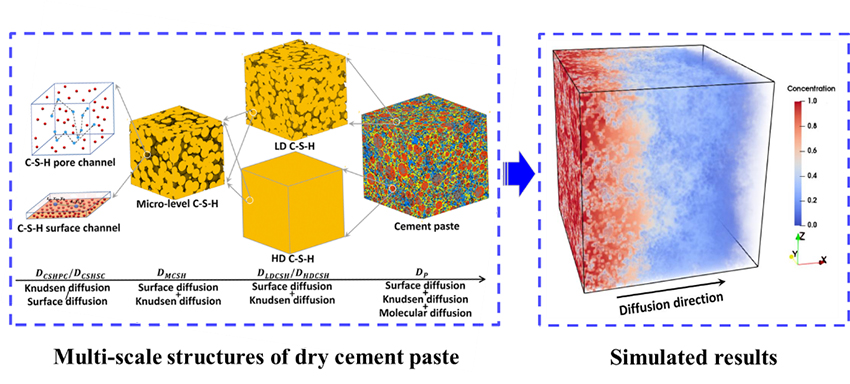 Numerical models have great potential for overcoming the above challenges. However, all existing numerical models treat the gas diffusion regime as molecular diffusion without considering the combined effects of surface and Knudsen diffusion, thus resulting in incorrect predictions. To address the problems above, Southeast University researchers: Cheng Liu (Ph.D. Student), Professor Zhiyong Liu and Professor Yunsheng Zhang developed a multi-scale model to simulate and analyze the effective gas diffusivity in dry cement paste, considering the combined effects of gas diffusion mechanisms. Their work is currently published in the journal, Cement and Concrete Research.