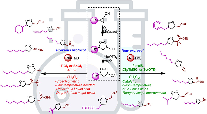 Therefore, an alternative approach utilizing a mild Lewis acid under catalytic amount at room temperature would be highly desirable to circumvent the degradation products and the utilization of sub-stoichiometric amount of Lewis acid under low temperature conditions. With the goal being to sidestep the aforementioned challenges, researchers from the Paris-Saclay University in France: Alexis Pinet, Dr. Bruno Figadère and Dr. Laurent Ferrié, developed a novel catalytic protocol of functionalization for 1,2-dioxolanyl acetates, identifying two efficient systems, namely Indium(III) chloride/ Trimethylsilyl Chloride and Scandium (III) Triflate. Their work is currently published in the research journal, Advanced Synthesis & Catalysis.