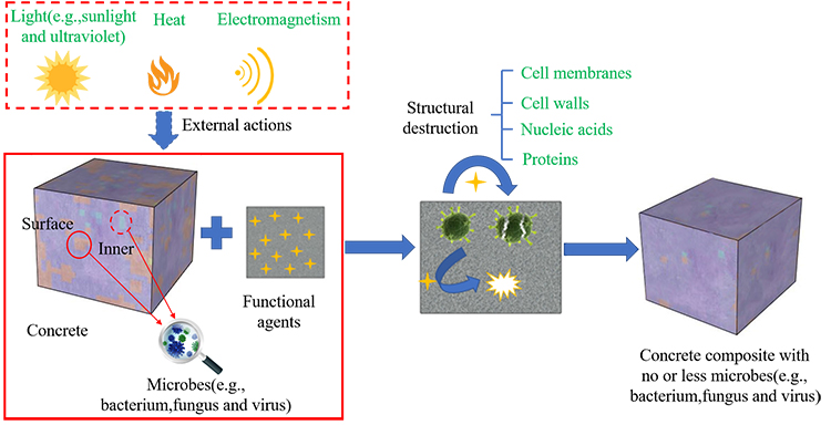 In brief, the authors explored the classification and application of antimicrobial agents in concrete. Next, a summary of the antimicrobial and structural properties of concrete materials incorporating antimicrobial agents was presented. Additionally, the antimicrobial mechanisms of selected organic and inorganic antimicrobial agents mainly towards bacteria were analyzed in detail. Lastly, the practical applications of antimicrobial concrete in different fields such as sewer systems and marine engineering were evaluated to validate the feasibility of the antimicrobial agents in protecting the materials against the microbial threat. Existing problems needed to be addressed were pointed out and future research opportunities of antimicrobial concrete were also explored.