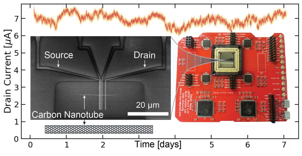 In a recent publication, Duke University researchers: Steven Noyce (PhD candidate), James Doherty (PhD Student), Dr. Zhihui Cheng, and Prof. Aaron Franklin in collaboration with Dr. Hui Han and Dr. Shane Bowen at Illumina, Inc. developed a measurement platform that allowed for robust, long-term testing of numerous CNTFETs concurrently in a fully automated manner. In addition, they also established bias ranges under which CNT transistors could operate continuously for months or more without degradation. Their work is currently published in the research journal, Nano Letters.