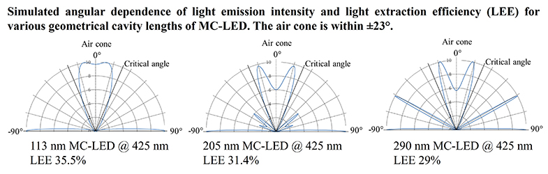 The research team demonstrated the possibility of attaining more accurate active layer positioning in the cavity. The antinode factor suggested the efficiency of the QW and cavity modes, and it depended on the QW position corresponding to the antinode of cavity modes. For the MC-LEDs with a cavity length of 113 nm at QW positions 46%, 60% and 75%, the corresponding peak external quantum efficiency (EQE) were 0.6%, 2.5% and 0%, respectively. Thus, it was expected to have the highest LEE of 35% at the QW position of 75%, but no emission was observed due to the excess current leakage due to the device fabrication process. On the other hand, MC-LED with a cavity length of 290 nm recorded the highest peak EQE of 6.7%. Furthermore, the peak wavelength was nearly constant at 430 nm for the current density ranging from 289 – 1868 A cm-2.
