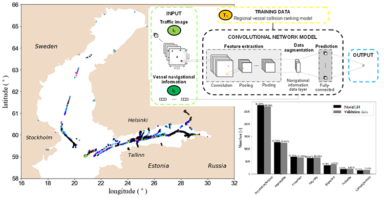 In brief, the presented method relied on Convolutional Neural Networks (CNNs) to recognize and interpret, in terms of collision risks, the images obtained from the AIS data. The model’s predictive accuracy was investigated in the presence and absence of additional navigational information. The reliability of the obtained data was validated by comparing it to the estimates derived from training data. Furthermore, data from the Baltic Sea was used as a case study to test and validate the applicability of different design model alternatives.