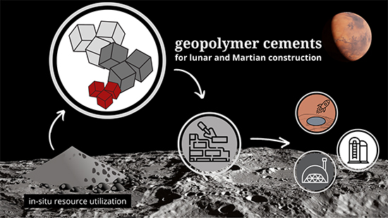 Several strategies have been proposed for extra-terrestrial construction, including solar-sintered regolith and sorel cement. Extra-terrestrial cement is mainly required for developing vertical takeoff/landing pads for Martian and lunar surfaces to protect against secondary ejecta consisting of debris and dust kicked up by landings and take-offs, as well as habitats to protect humans and equipment against the harsh environmental conditions, including radiation. Compared with other strategies, the geopolymer binder has several advantages. It can serve as a bulk binder because it is rich in aluminosilicate minerals, and it requires less energy and water to prepare. Interestingly, the feasibility of producing geopolymer binders using Martian and lunar regolith simulants has been demonstrated. However, more studies are still needed to understand geopolymer binders fabricated from different regolith simulants and methods.