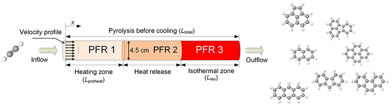 It is worth noting that the existing kinetic mechanisms of C2H2- polycyclic aromatic hydrocarbons are less accurate and unsuitable for predicting C2H2 conversion rate as well as the formation of two- to four-ring aromatics. Unlike the previous computational models for tubular flow reactors, the proposed reactor module comprised of three serially connected plug flow reactors taking into consideration the three zones: preheating, heat release and isothermal conditions. The plug flow reactors were particularly used to represent the characteristics of thermalization effects at chemically reacting conditions. Furthermore, the presented mechanism is generally a combination of the kinetic databases derived from two existing mechanisms but with added missing reactions and rate constants.