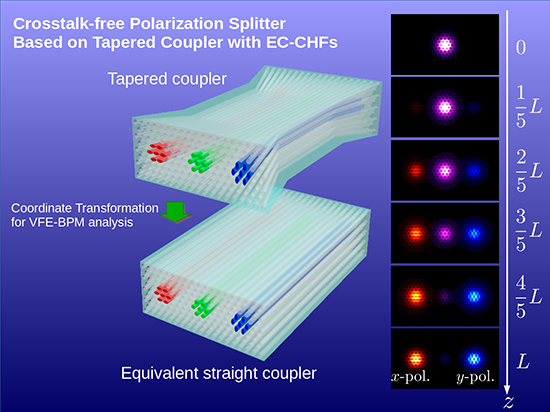 Briefly, the authors commenced their work by first exploring in detail the formulation of the coordinate transformed full-vectorial FE-BPM (CT-VFE-BPM), which was then used in the design and development of the proposed tapered polarization splitter. The coordinate transformed finite element beam propagation method was charged with transformation of the tapered waveguide into an equivalent linear waveguide to prevent degradation of computation accuracy associated with the step approximation and the interpolation of the electromagnetic field in the propagation direction. The cross-sectional structure design consisted of five air holes between the adjacent cores to obtain sufficient waveguide separation.
