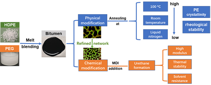 Results showed rheological property on each complex modulus variation with temperature curves of the PE/PEG modified bitumen. The authors, however, observed that various annealing treatments could regulate the initial temperatures at a stable complex modulus plateau. The sample annealed at a temperature of 100 °C, which is close to the crystallization temperature of PE, exhibited the best rheological stability. This was attributed to the close relationship between the crystallinity and stiffness of the PE-rich network induced via VPS. Furthermore, thermal stability, complex modulus and solvent-resistance of PE modified bitumen improved when the PEG modifier was partially replaced with the same fraction of 4,4′ -diphenylmethane diisocyanate (MDI). It also refined the PE-rich network structure, resulting in better solvent resistance.