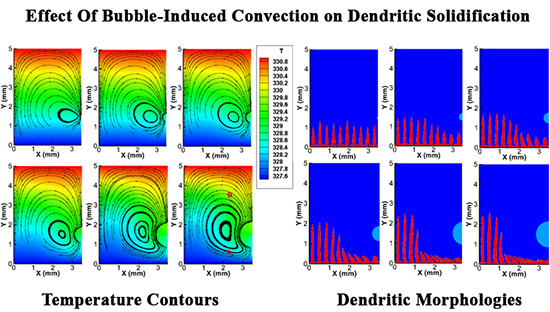 The research team reported that Marangoni convection for larger bubbles can alter the morphology of dendrites, but the effects are negligible for smaller bubbles. Further, simulation results showed that the dendrites near a bubble have more branches and grow slower than the neighboring dendrites.