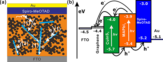 The authors reported a significant enhancement of the charge transfer efficiency and the overall device performance due to the application of graphene-CuInS2 quantum dots composite. A significant improvement in the power conversion efficiency up to 17.1 was also observed. Besides, the resulting solar cells exhibited higher air stability and reproducibility. The high performance could be attributed to the improvement in the electron injection and light harvests. The charge transfer time was approximately 9 ns, as per the time-resolved photoluminescence measurements, which favored a higher energy injection rate. Furthermore, it was noted that the alignment of the energy level of graphene and MAPbI3 matched that of the CuInS2 quantum dots.