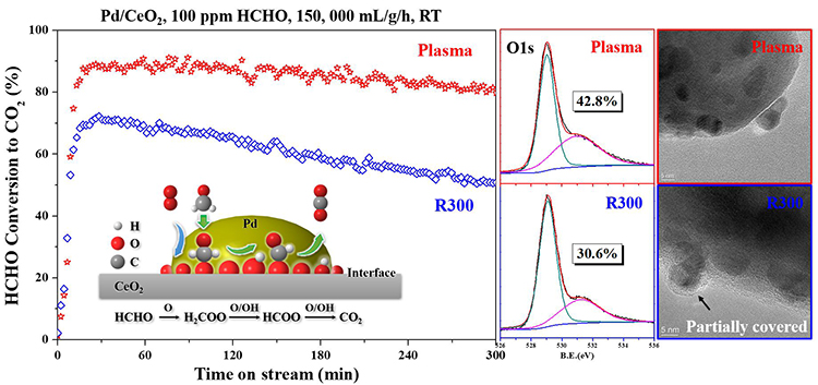 The research team observed that unlike the R300 sample, non-thermal activated sample exhibited remarkably high activity and stability due to narrower particle size distribution, smaller palladium particle size, and numerous active surface oxygen species. The performance of the non-thermal activated Pd/ceria catalyst was compared to that of conventional reduced sample for a 300 min formaldehyde conversion test. Results showed for Pd/ceria catalyst, the conversion of formaldehyde to carbon dioxide was kept over 80% at a concentration of 100 ppm and a space velocity of 150000 mL/g/h during the entire test duration. However, the formaldehyde conversion dropped from 70% to 50% in the case of the conventional thermally activated sample because the palladium particles were partially covered by ceria layer, thus blocking oxygen activation and mobility abilities. Moreover, in situ DRIFT characterization revealed that the presence of water significantly increased the formaldehyde conversion into carbon dioxide, mainly because the Pd/ceria catalysts intermediates consisted of formate, polyoxymethylene and dioxymethylene species.