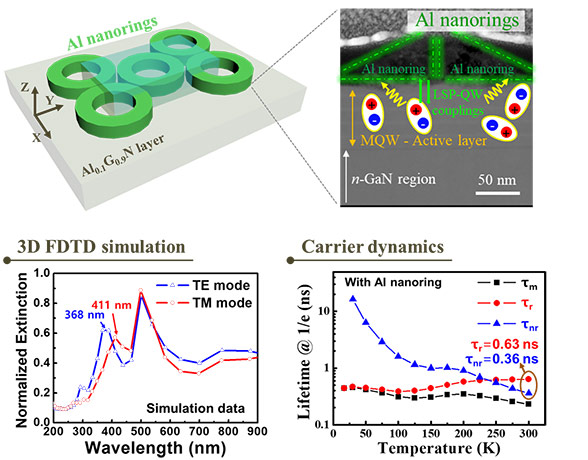A team of researchers led by Professor Tae Geun Kim from the School of Electrical Engineering at Korea University proposed a study whose main objective was to cross-examine the effect of an aluminum nanoring structure on the light extraction efficiency from AlGaN/GaN multiple quantum wells of 365nm LEDs through the localized surface plasmons coupling effect. They hoped that their technique would result in simultaneous enhancement of both the internal quantum efficiency and external quantum efficiency. Their work is published in the research journal, Photonics Research.