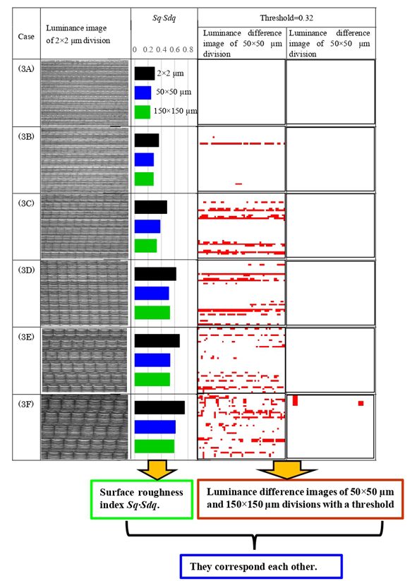 The authors observed that the low values of root mean square luminance/luminance mean as well as that of the root mean square luminance differences were of high quality and reliable indices, thereby desirable for evaluating surface quality. For all the examined minute divisions (150 × 150 µm,50 × 50 µm and 2 × 2µm), the relationship between the surface roughness index and luminance index and that between surface roughness index and root mean square luminance difference exhibited positive correlations with each other. By visually evaluating the surface quality, it was possible to identify the uneven machined surfaces based on the resulting luminance differences. This was more effectively and precisely achieved when threshold values were applied to the images.
