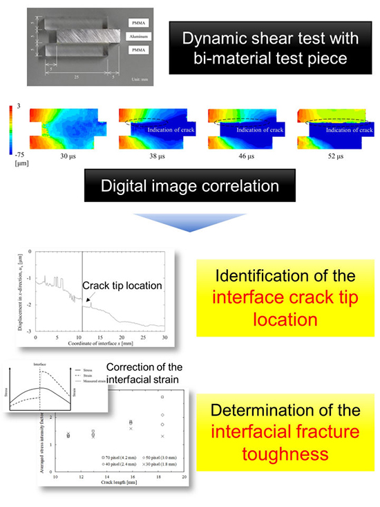 In their approach, aluminum material at the center and polymethyl methacrylate (PMMA) resin layers bonded on both sides formed the three-layered test piece. These materials exhibited dissimilar elastic wave propagation characteristics. Next, high-strain-rate shear tests were conducted with Split-Hopkinson pressure bar (SHPB) set-up. Finally, a combination of an ultrahigh-speed video camera and DIC was used to investigate the propagation of the elastic stress wave and locate the interface crack tip, then the fracture toughness was evaluated at the aluminum/PMMA bonded interface.