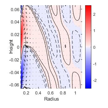 Figure legend: At radius ratio η=0.1 and cylinder rotation ratio µ=0.15 radiative instability is the dominant form of instability at onset. Strong flow occurs near the inner cylinder, which triggers waves radiating towards the outer cylinder. Colors and contours denote flow in the azimuthal direction, arrows flow in a vertical cross-section.