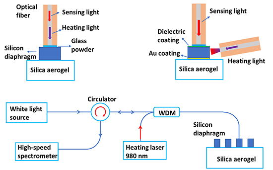 On this account, Dr. Qiwen Sheng, Dr. Nezam Uddin, Mr. Bohan Zhou, Ms. Xiaoli Wang and Professor Ming Han from Michigan State University developed a new fabrication method of silicon-tipped fiber optic FPI temperature sensors by bonding either a coated or uncoated small silicon diaphragm to the tip of the fiber using aerogel-assisted glass soldering with precise 980 nm laser heating. An optical fiber was used to deliver the heating laser to the silicon FPI, while a 1550 nm white light system was utilized to monitor the FPI temperature changes, enabling localized, precise laser heating and precise temperature control. Silica aerogel plates were used as substrates for silicon parts. The work is currently published in the journal, Optics Letters.