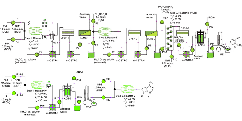 The authors obtained 14.1% isolated yield of the target nucleobase unit compound with a throughput of 2.96 g.h-1 and residence time of 79 min under optimal flow conditions. The total residence time obtained via continuous flow processing was significantly shorter than that of batch procedures. In addition, the highly exothermic N-amination and Vilsmeier–Haack reactions involving unstable and hazardous intermediates, strict cryogenic conditions for bromination reaction and oxidative liquid-liquid biphasic transformation were effectively facilitated through the improved protocol.