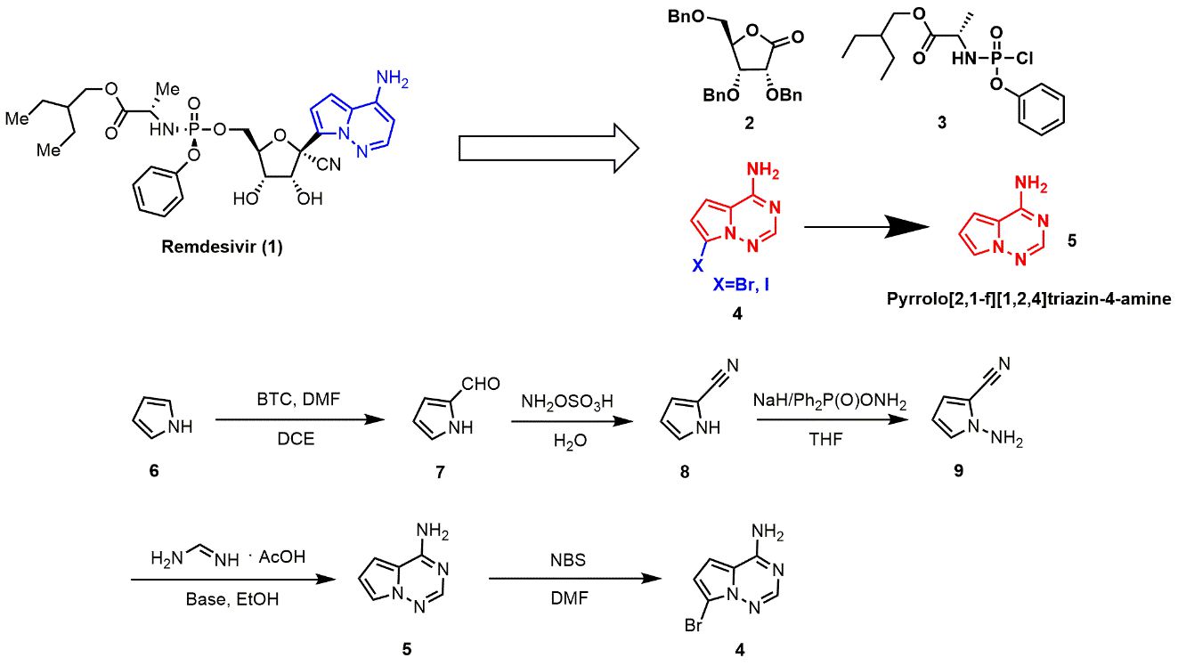 Through retrosynthetic analysis, remdesivir can be synthesized from three different building blocks: ribolactone unit, phosphoramidate unit and adenine-mimicking nucleobase unit. The synthesis of the nucleobase unit plays a crucial role in the preparation of the target product remdesivir, because its synthesis is still problematic and far from mature, though several synthetic routes have been reported.