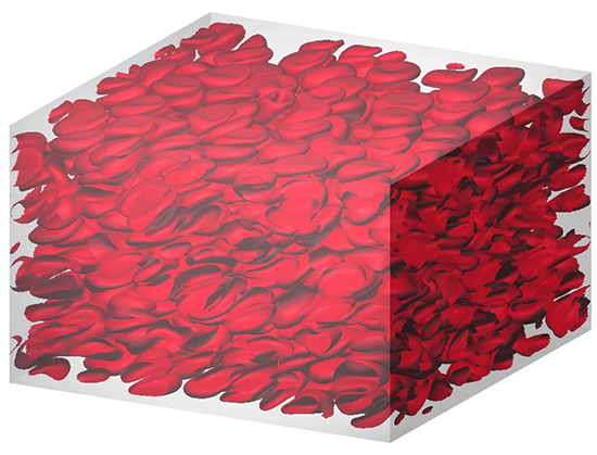 Technically, for them to obtain a rheological description of RBC suspensions, they had to investigate the effect of a wide range of viscosity ratios λ = 0.1–10, non-dimensional shear rates capillary number, (Ca) and volume fractions φ. The researchers subsequently performed numerical simulations to study the behavior of RBCs subjected to various Ca in wall-bounded shear flow from dilute suspensions to dense suspensions. In their approach, RBCs were modelled as biconcave capsule, whose membrane follows the Skalak constitutive law. Owing to the nature of their problem, they resorted to employing graphics processing unit (GPU) computing, using the lattice-Boltzmann method (LBM) for the inner and outer fluid, and the finite-element method (FEM) to follow the deformation of the RBC membrane.