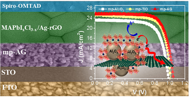 To solve such problems, a team of researchers from the Solar Energy Research Center at Jeonbuk National University in Republic of Korea: Dr. Tahmineh Mahmoudi, Dr. Y. Wang and led by Professor Yoon-Bong Hahn, proposed to improve on the device performance and long-term stability by fabricating PSCs based on MAPbI3-xClx:Ag-rGO and Al2O3-graphene (mp-AG) composites with FTO/SrTiO3/mp-AG/perovskite:Ag-rGO/Spiro-OMeTAD/Au configuration. Their work is currently published in the front cover of the research journal, Advanced Energy Materials.