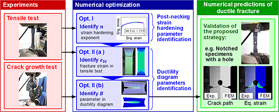 The research team demonstrated the applicability of the proposed strategy to both thick plates as well as thin sheets, which could not be achieved using conventional methods. The the post-necking hardening behaviors and the ductility diagram parameters were successfully identified via the flat tensile test and the Arcan test. The validation experiments involved tests utilizing two plate specimens with a hole. The results showed good agreements between the numerical prediction and the crack propagation and load-displacement curve histories obtained experimentally. These results indicated the accuracy and feasibility of the proposed strategy.