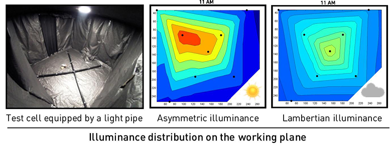 The authors reported that the light distribution within the room was strongly related to the type of sky. It was also seen that in cloudy skies, the diffuser behaved like an orthotropic source whose diffusion followed a Lambertian law. Indeed, the light pipe acted as a black box. Further, the researchers noted that the profile of the indoor illuminance was similar to the profile of the outdoor. Additionally, in a clear sky, the observation was no longer valid. The indoor lighting became directional, linked to the position of the Sun. Lambert’s law was no longer valid.