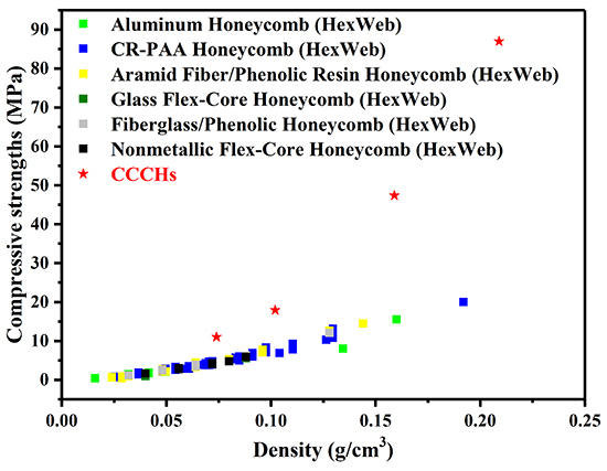 Results showed that the curved wall topology design effectively improved the buckling resistance of the structures. Compared with other honeycomb structures, the out-of-plane compressive strength and specific out-of-plane compressive strength of the CCCHs are 2-4 times and 3-4 times, respectively. Moreover, the out-of-plane compressive strengths increased with either an increase in the wall thickness or decreased curvature radius. And the predictions agreed well with the measurement results. Additionally, the out-of-plane compressive strengths of the laminated CCCHs were notably superior to those of the available lightweight honeycombs.