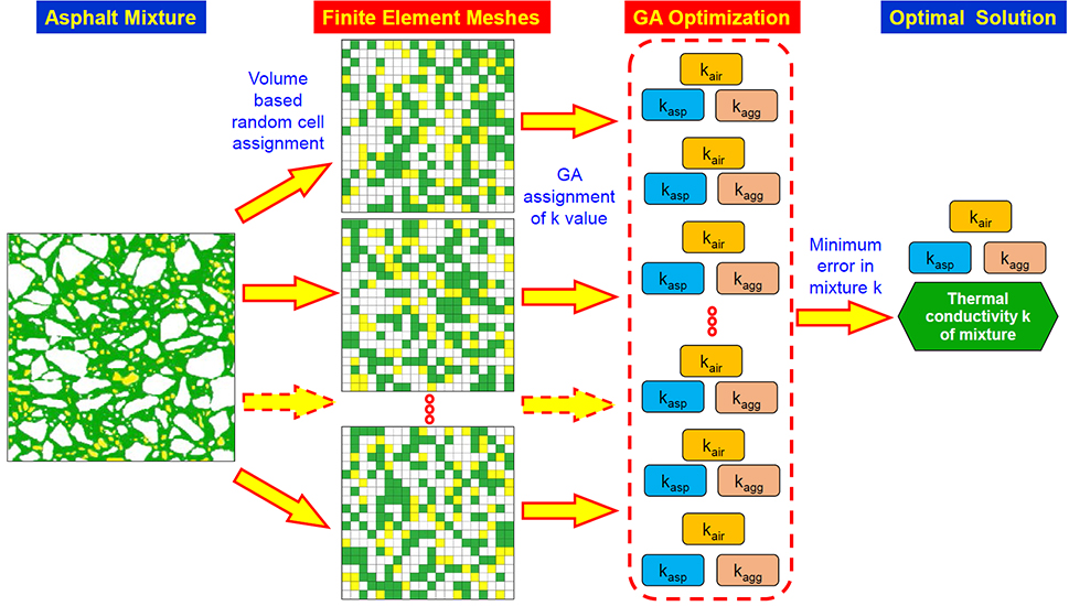 In their approach, the asphalt mixture to be analyzed was represented by a two-dimensional row-column structure. Based on the row-column structure, a computer simulation model of heat conduction in an asphalt mixture was developed to derive the thermal conductivities of the mix. At this juncture, two cases were considered. The first case involved simulations with known thermal conductivity values of the mixture constituents, while the second case involved simulations with unknown thermal conductivities of one or more of the constituents. For the second case, the authors calibrated the model using a genetic-algorithm to determine all the unknown thermal conductivities from the known laboratory or field values of mixture k. Lastly, the feasibility of the model in determining the thermal conductivities of asphalt mixtures was demonstrated using examples.