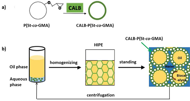 In brief, the authors commenced their research work by preparing an enzyme-decorated polymeric nanoparticle to stabilize oil-in-water HIPEs by surfactant-free emulsion copolymerization of styrene and glycidyl methacrylate. Next, they were covalently decorated with a model lipase Candida Antarctica lipase B (CALB). Finally, taking the enzyme decorated polymeric nanoparticles as a stabilizer, stable Pickering HIPE was obtained by homogenizing heptane into nanoparticle aqueous dispersion.
