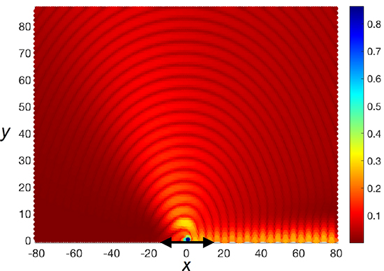 The authors found out that in the gyroscopic elastic lattice, the shapes of the elliptical trajectories were different for surface waves propagating in opposite directions. Even though the dispersion curves were symmetric with respect to the zero wavenumber on the frequency-wavenumber diagram, numerical computations revealed that in-plane inertial coupling due to the gyroscopic effect broke down the symmetry of the eigenmodes making the system non-reciprocal. This uncommon effect was attributed to the presence of the gyroscopic system, affecting the behavior of surface and bulk waves generated by the external force on the boundary. An example of the response of a gyroscopic elastic lattice is shown in the featured figure.