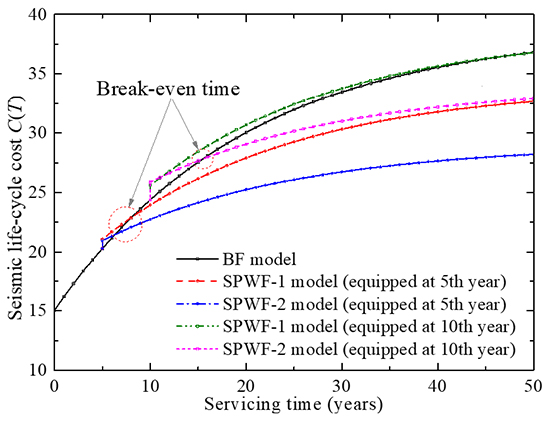 The authors reported that the relationship between the ratio of seismic failure cost to initial cost η and 1/β could be simplified by a power function, and the relationship between the A-parameter in the power function and the servicing time could also be simplified by a new power function. Moreover, various advantages that could be ripped from the proposed approach were reported.