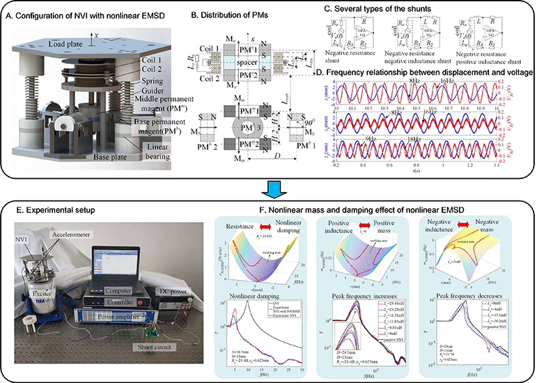 In their approach, they started by exploring the mass and damping mechanisms of nonlinear-EMSD considered crucial in modeling and optimizing the performance of NVIs. Equivalent nonlinear damping and mass were realized through an electromagnetic structure design comprising two permanent magnets and two coils. On the other hand, the stability and transmissibility of NVI with N-EMSD were computed using a combination of the harmonic balance method (HBM) and Jacobian matrix. The damping and mass effects of NVIs with nonlinear-EMSD were verified via parameter analyses, theoretical and experimental modeling. Lastly, experimental results and the performance between linear and nonlinear-EMSD were compared to provide more insights into the vibration attenuation enhancement of nonlinear-EMSD.