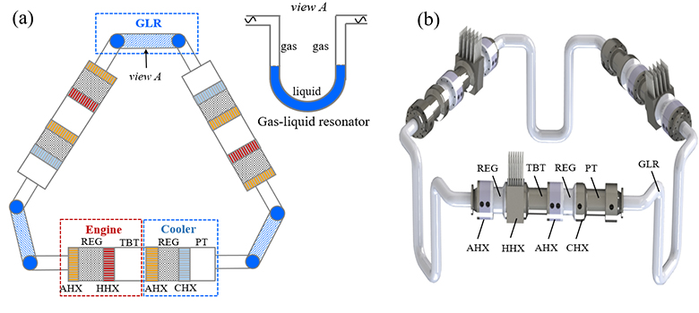 First, theoretical analyses on multi-stage systems were performed to investigate steady performance and onset features. Then the research team studied carefully the effects of liquid volume ratio, mean pressure, and expected liquid mechanical damping coefficient on working frequency and onset temperatures in systems with different stages. A comparison of the system’s onset performance was also made with conventional gas-only resonator systems.