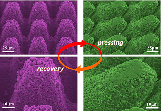 The authors reported that the obtained SMP surface showed superhydrophobicity and extremely low adhesion to water droplets. In fact, the micropillars on the SMP were observed to lean to one side when the surface was pressed by a force, and they could easily recover to stand state by heating. Additionally, with the reversible switching of the micropillars between original shape and temporary shape, the superhydrophobicity of the resultant surface could be reversibly weakened and re-obtained; thus, showing memory property.