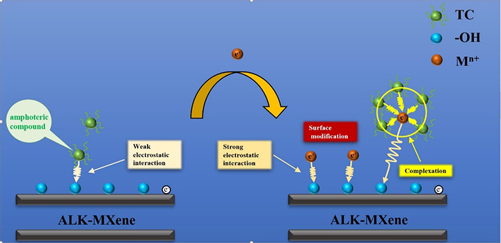 From the batch adsorption experiments, the research team showed that introducing metal ions significantly improved the TC adsorption capacity by adjusting the ALK-MXene surface with metal ions in the water environment. The alkalization process was responsible for increasing the MXene interlayer spacing while maintaining the layered structure. Consequently, the transformation of surface -F to -OH was observed. As a result, a 750% increase in the removal capacity when coexisting with Ni(II) was obtained. The significant increase in TC adsorption was attributed to three main reasons: adsorption at the hydroxyl site on the ALK-MXene surface, surface modification by metal ions and further improvement by complexation.