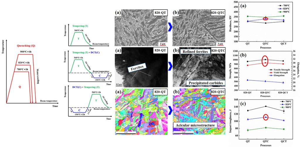 To bridge the existing research gap, Zeju Weng (PhD candidate), Dr. Kaixuan Gu, Dr. Kaikai Wang, Xuanzhi Liu ( Master degree candidate), and Professor Junjie Wang from Technical Institute of Physics and Chemistry investigated the effects of a combination of deep cryogenic treatment and inter-critical quenching on the microstructure and mechanical properties of 30CrMnSi alloy steel, particularly strength and toughness. Prior to deep cryogenic treatment, initial states of microstructure were obtained through quenching treatment conducted at different austenitizing temperatures of 780 °C, 820 °C, and 900 °C. Furthermore, they investigated the influence of different treatment and the underlying mechanisms were examined through various characterization methods like scanning electron microscopy. The work is published in Materials Science and Engineering: A journal.