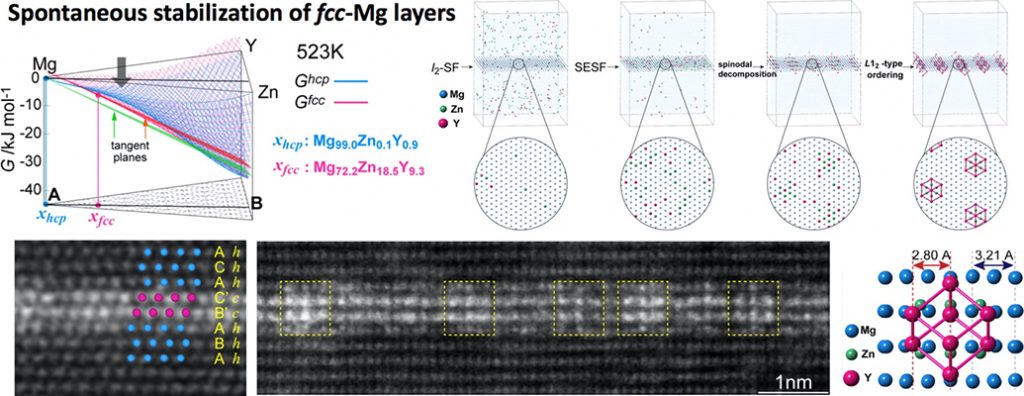 The authors reported that the Zn/Y co-segregations at the SESF provided a remarkable condition whereby the fcc layers become more stable than the hcp-Mg matrix. Furthermore, within the SESF, the following spinodal-like decomposition into the Mg-rich solid-solution and the Zn/Y-rich L12-type order phase was reported to cause a significant reduction of the total Gibbs energy of the system.