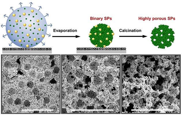Their goal was to introduce a method to increase the porosity of supraparticles and circumvent the limit set by capillary compression. To achieve this, the team prepared TiO2 supraparticles with hierarchical porosity by first constructing TiO2−polystyrene (PS) binary supraparticles on superamphiphobic surfaces and then removing the PS phase by calcination. Moreover, they related the porosity of superparticles to the volumetric ratio of TiO2 to PS.