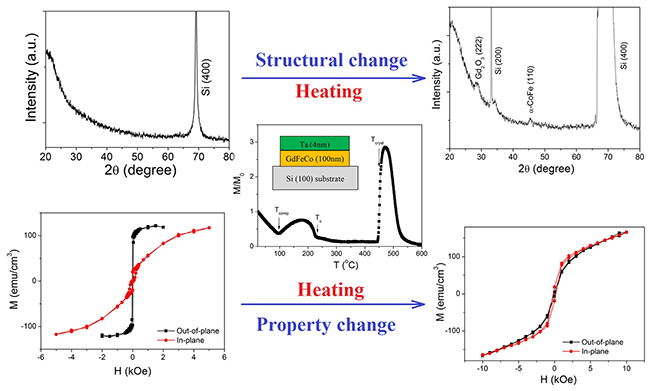 In their approach, the GdFeCo films with good perpendicular magnetic anisotropy were fabricated by sputtering a composite target method. Thermomagnetic measurements were used to determine the compensation and Curie temperatures. Also, the effects of temperature on the thermal degradation as well as perpendicular magnetic anisotropy of the GdFeCo alloy films were investigated. “GdFeCo alloy film is one of the promising ferrimagnetic materials for spintronic devices. However, the amorphous structure is thermodynamically metastable, which may lead to the severe deterioration of the key functional properties during heating. Our work is to investigate the degradation mechanism of the GdFeCo alloy films. We aim to provide some useful information for the GdFeCo-based spintronic devices particularly used in high temperature region,” Prof. Ke Wang explains.